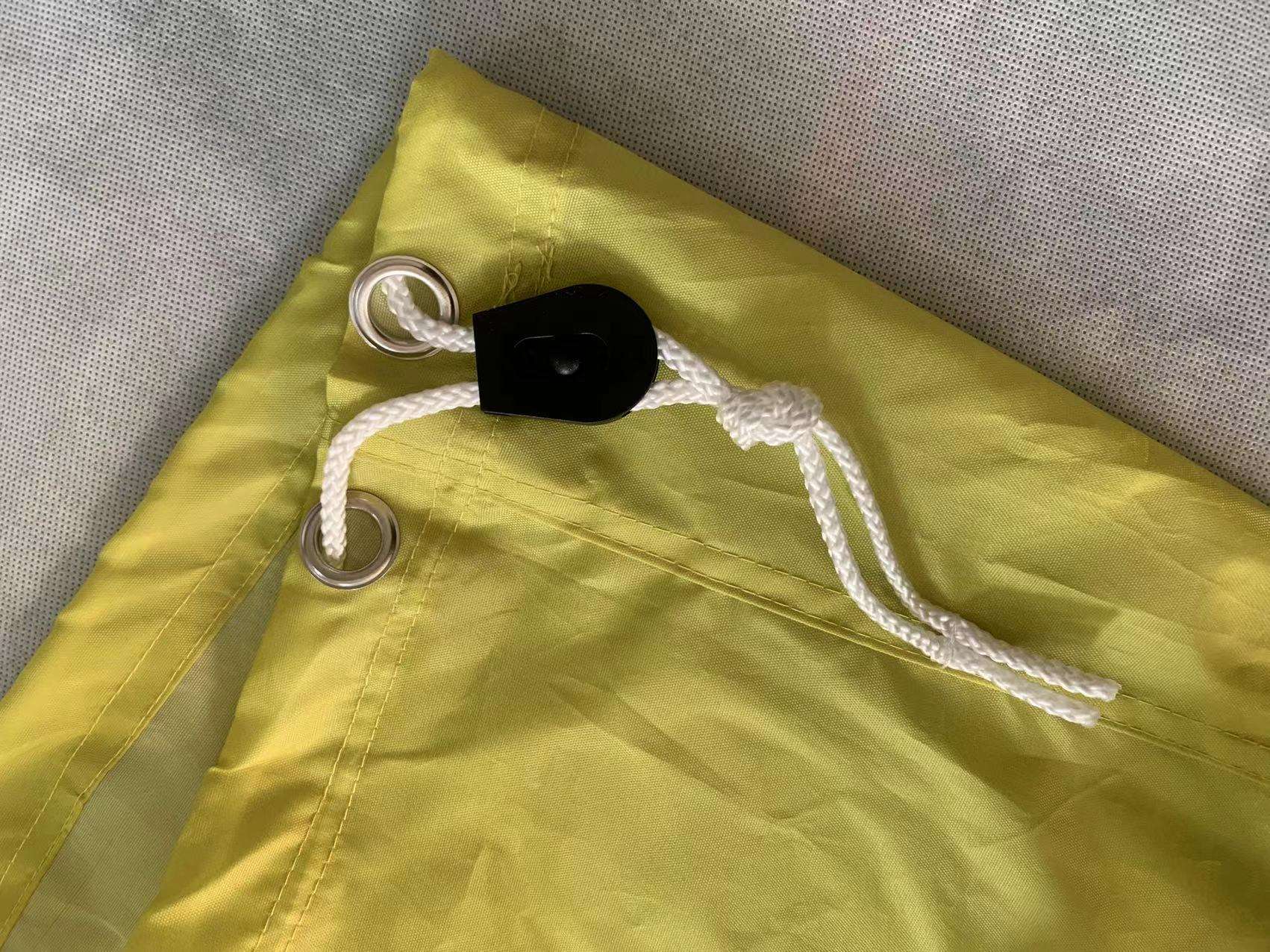 - L’extrémité de la drisse de fermeture est cousue au sac, évitant ainsi les nœuds et renforcée par des œillets.